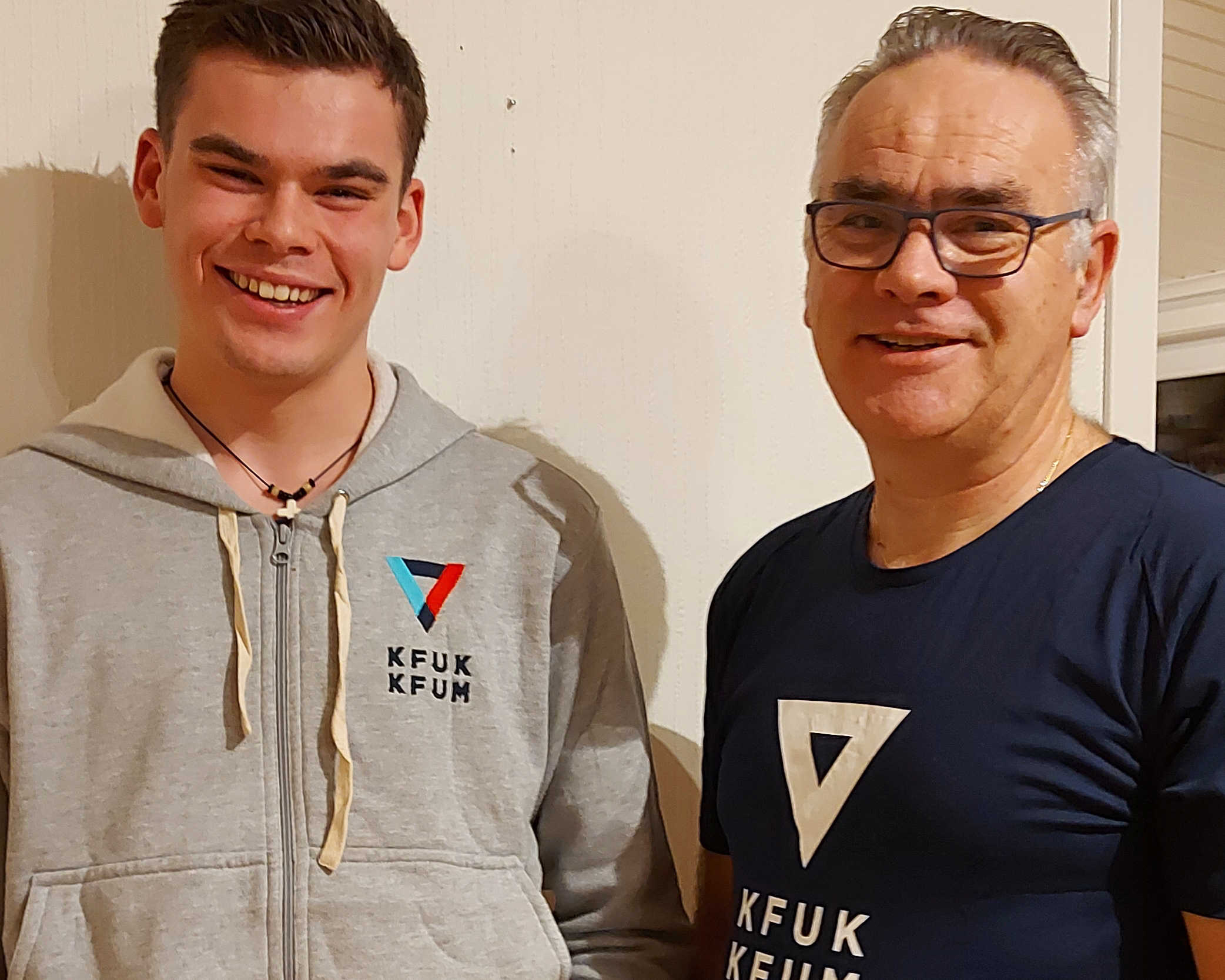 Eirik Wirak (18) og Trond Wirak (57) side om side. Far og sønn med sterkt engasjement for barn og unge i Grimstad KFUK-KFUM. - Jeg sitter også i kretsstyret her i Agder KFUK KFUM, og jeg er speiderleder i Grimstad KFUK KFUM Speidere, jeg er også med som ungdomsleder i ledergruppa i Apell Ten Sing, sier Eirik.
