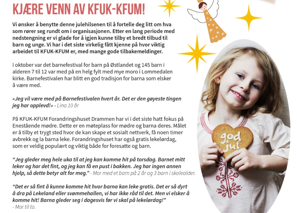 Her er et utdrag av julens giverbrev, som forteller noe av det du er med på å gjøre for barn og unge i KFUK-KFUM.
