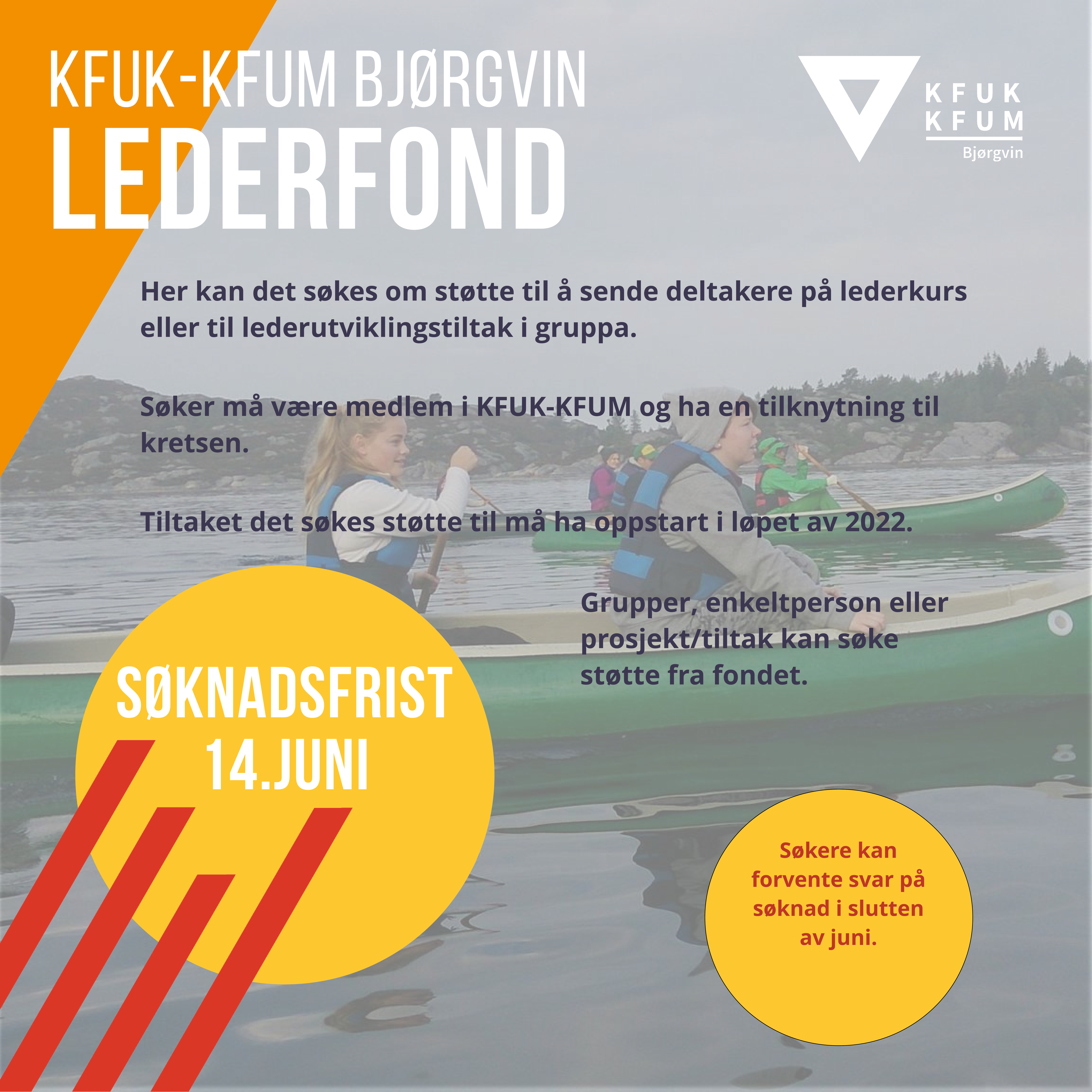 Vi kunngjer med dette søknadsfristen til KFUK-KFUM Bjørgvin Lederfond i år er satt til 14.juni 2022.